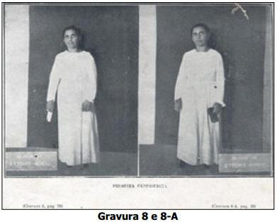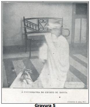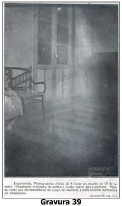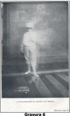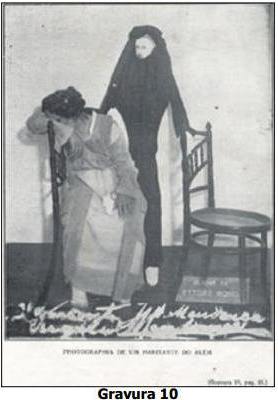 Na fotografia que reproduzimos e que é cópia fiel do clichê do maestro Bosio, vê-se colado à parede branca e junto à senhora do Sr. Eurípedes, a qual é a médium, uma figura humana, envolvida numa túnica preta, divisando-se-lhe apenas o rosto.