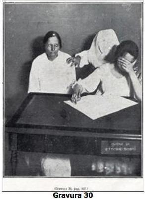 Esquisita é a fotografia de nº 30. Vê-se entre a Sra. Leopoldina Fernandes e a Sra. Antonina, que é médium psicógrafa, um vulto com o rosto coberto. Em inúmeras fotografias publicadas em obras congêneres temos observado casos idênticos. Consulte-se, por exemplo, os recentes trabalhos de Madame Lacombe e de Madame Bisson.