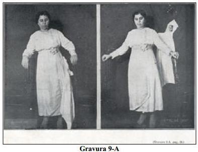 Fotografia obtida às 9 horas da manhã de 19 de Janeiro. Fantasma diáfano, de estatura muito maior que a médium. Veja-se, como que se derramando do corpo da médium, a onda fluídica formadora do fantasma.